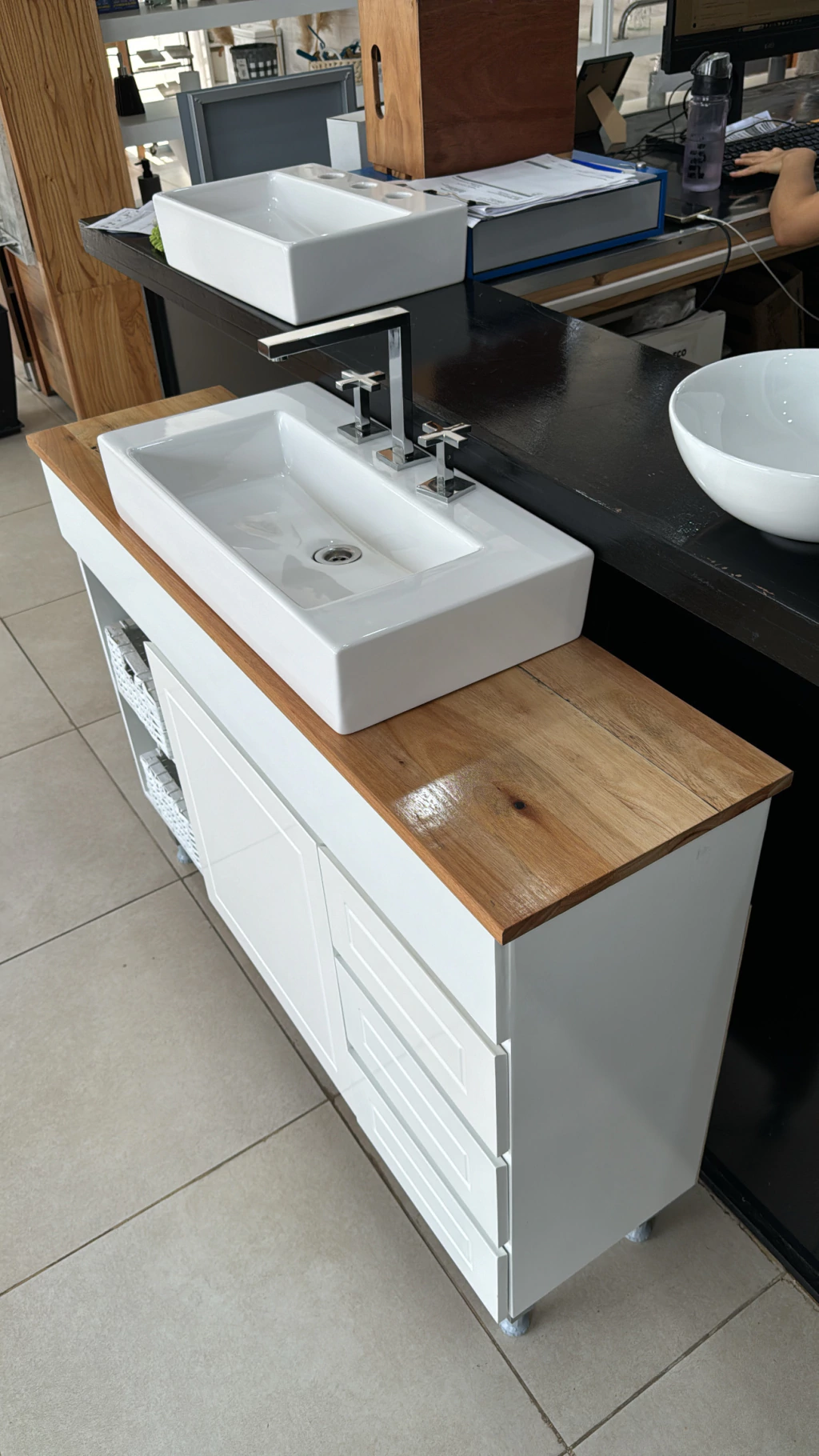 1- Mueble NILA de mdf laqueado PREMIUM, cuenta con guias telescopicas de alta calidad y la madera tiene un laqueado de 4 capas, pensado para resistir la humedad y el uso diario de un baño.
